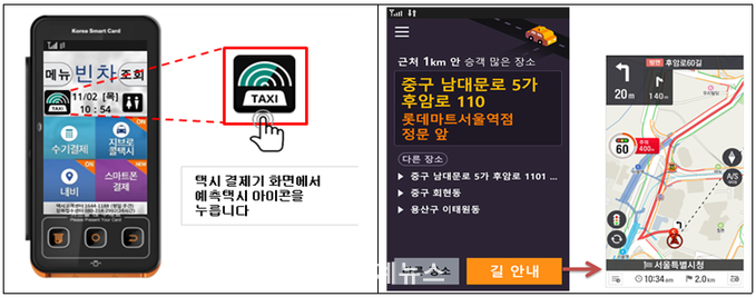 AI 택시는 서울시를 100m×100m 단위의 존(Zone)으로 구분하고, 해당 존의 택시수요를 예측하는 시스템이다. 이를 안드로이드 기반의 택시 결제 단말기에 표출하여 택시기사가 택시수요가 많은 지역으로 쉽게 이동할 수 있도록 도와주는 역할을 한다.