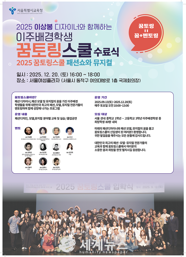 [세계뉴스 = 차성민 기자] 서울특별시교육청은 오는 20일 '2025 전문가와 함께하는 이주배경학생 꿈토링스쿨'의 수료식을 개최한다. 이 프로그램은 다양한 문화적 배경을 가진 청소년들이 예술을 통해 하나 되는 기회를 제공하고자 마련됐다.