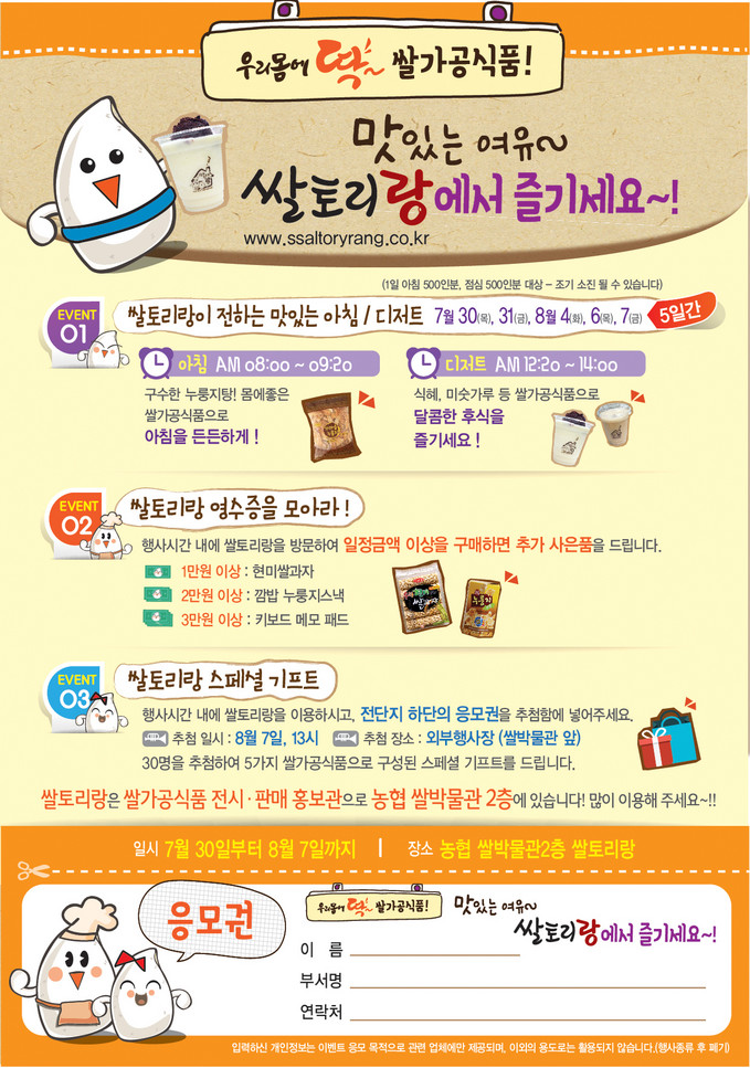 시식행사와 더불어 다양한 이벤트도 진행되는데 행사기간 중 ‘쌀토리랑’에서 쌀가공품을 일정 금액 이상 구매하는 고객에게 사은품이 증정되고 경품 응모권을 발행하여 당첨자에게는 푸짐한 쌀가공품 선물상자를 준다. 또한 아이들 지능 향상에 도움 되는 쌀토리 모양의 페이퍼토이 이벤트도 진행될 예정이다.