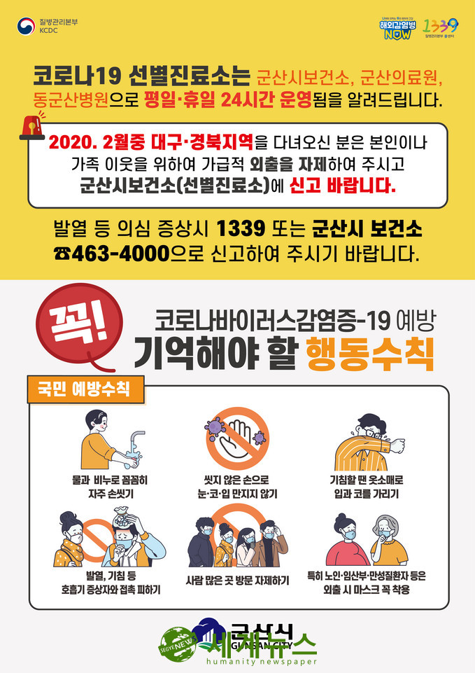 시 관계자는 “전 시민이 코로나19의 확산을 완벽하게 차단하는 철통경비 체계 구축을 위해 예방수칙을 철저히 준수하고 외지 방문이나 행사.집회 등은 취소 또는 연기할 것을 거듭 당부드린다”며 “시에서도 심각 수준에 맞는 자세로 감염증 확산을 위한 빈틈없는 대응책을 마련해 군산시민의 건강과 안전을 지키는 데 최선을 다하겠다”고 말했다.