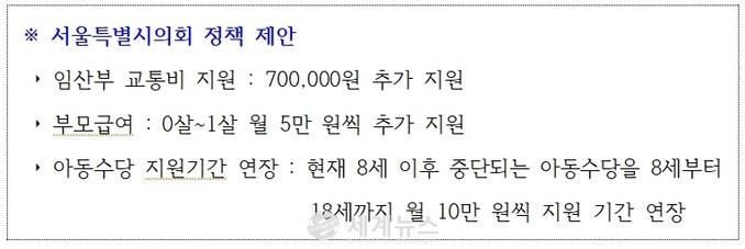 서울시의회는 서울시와 협의해 임산부 교통비 및 부모급여, 아동수당의 지원 규모와 시기 등을 확대함으로써 가시적으로 1억 원 이상은 지원되도록 할 예정이다.