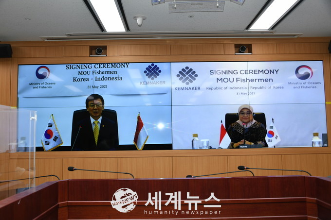 [세계뉴스 김광중 기자] 해양수산부(장관 문성혁)와 인도네시아(이하 ’인니‘) 인력부(장관 이다 파우지야(Ida Fauziyah))는 5월 31일(월) 온라인 서명식을 통해 근해 어선원 고용ㆍ노동 부문 협력 강화를 위한 양해각서(MOU)를 체결했다고 밝혔다.