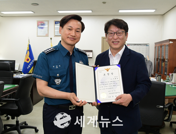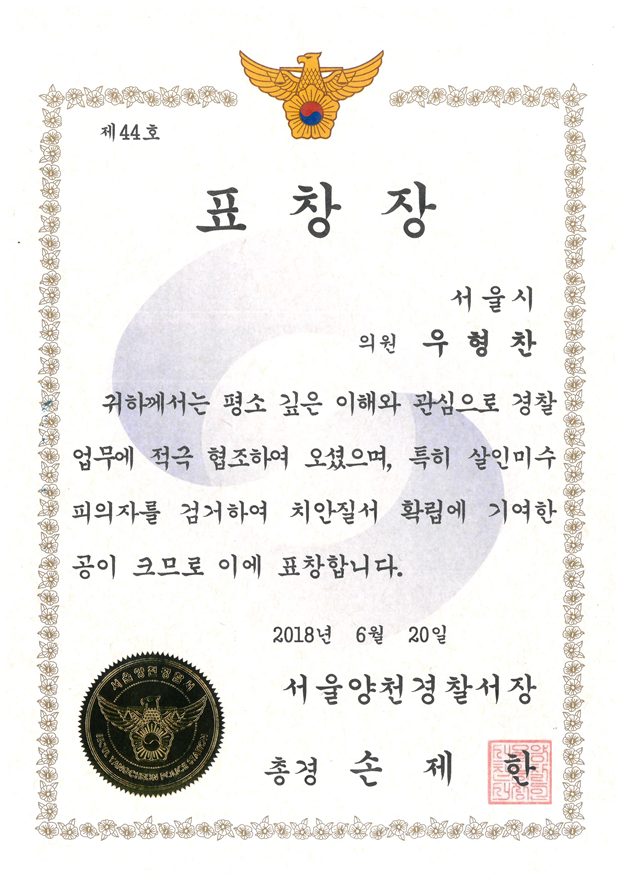 [세계뉴스] 정서영 기자 = 서울 양천구 편의점 강도 사건의 여성 피해자를 구한 우형찬 서울시의원이 20일 양천경찰서로부터 살인미수 피의자 검거와 치안질서 확립에 기여한 공으로 표창장을 받았다.