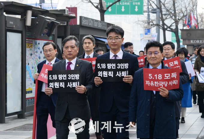 한편 이 날 결의안 통과에 앞서, 더불어민주당은 오후 1시 서울시의회 본관 정문 앞에서 ‘자유한국당 5.18 망언3인방 규탄대회 및 자진사퇴 촉구 거리 행진’을 진행했다. 규탄대회에는 서울시의회 더불어민주당 소속 의원들과 시민들이 함께하여 5.18민주화정신을 폄훼한 자유한국당 망언 3인방의 자진사퇴를 촉구하는 규탄문을 낭독하고 구호를 제창하며 광화문 광장으로 거리행진했다.