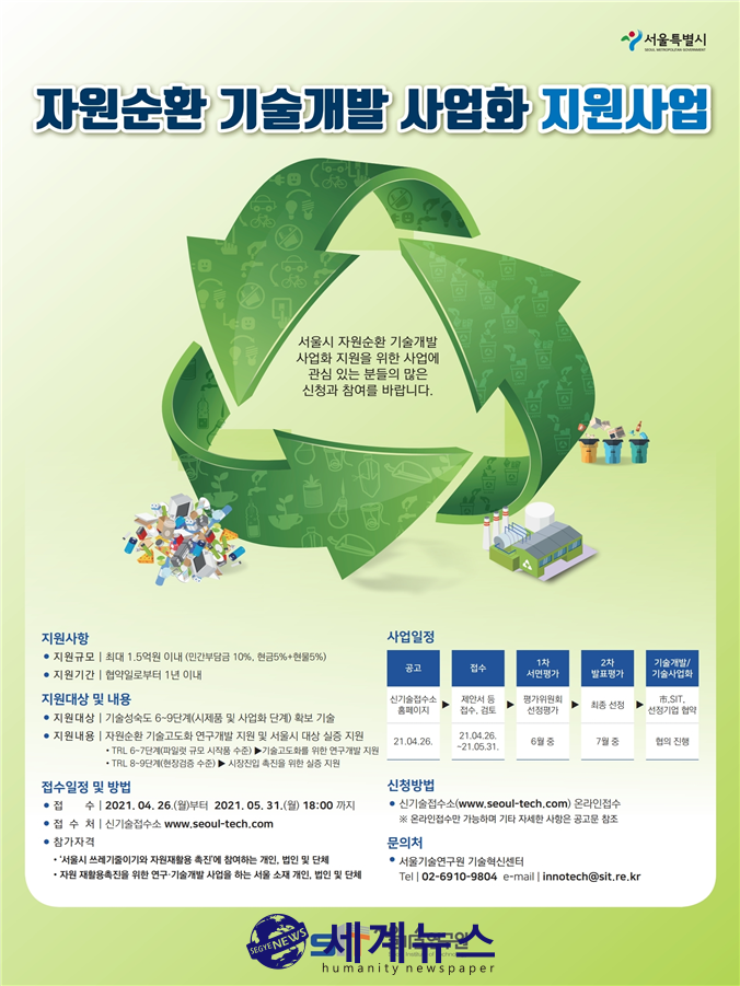 [세계뉴스 윤소라 기자] 서울시가 현재 폐기물 처리에 집중되어 있는 기술개발 지원사업 대상을 확대해 근본적인 폐기물 원천감량을 위한 자원순환 분야 기술개발 지원 사업을 추진한다.