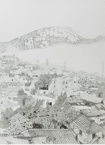 옥상에 올라 서촌의 풍광을 담아낸 펜화 작품들로 서촌 옥상화가라는 이름을 얻은 김미경(58) 작가는 5년 전 서촌에서 열병을 앓았다. 0.03mm 펜촉으로 옥상에서 보이는 기와집들을 개수까지 세어가며 그렸다.