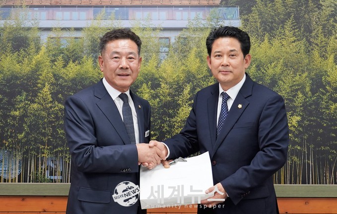 ▲ 5일 서울 종로구의회 제8대 여봉무(오른쪽) 의장이 담양군의회 최용만 의장을 예방하고 의정활동 공유와 지역 특성화 녹지조성 등 교류협력 하기로 했다. |