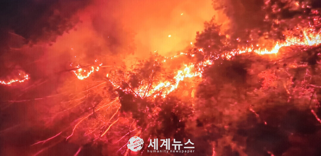 [세계뉴스 = 탁병훈 기자] 지난 22일 경북 의성에서 발생한 대형 산불이 안동과 영양, 영덕으로 급속히 확산하며 대한민국 역사상 최대 규모의 산불 위기로 번지고 있다.