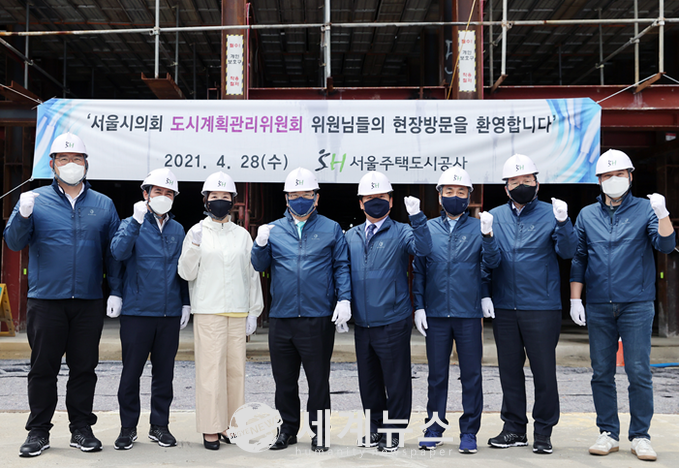▲ 서울시의회 도시계획관리위원회 김희걸 위원장(왼쪽 4번째)이 위원들과 제300회 임시회 기간인 28일 ‘위례 택지개발조성 사업지구’ 현장을 방문해 관련 업무를 보고 받고 사업 진행상황 등을 점검했다. |