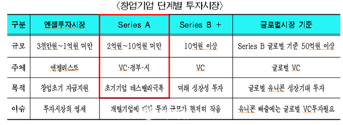 현재, 한국은 시리즈 A단계 기업당 평균 투자금은 USD 1.1M으로, 런던의 USD 약 7M, 실리콘밸리의 USD 6.5M와 비교하면 상대적으로 적어서 초기 투자 생태계 활성화가 절실한 상황이다.