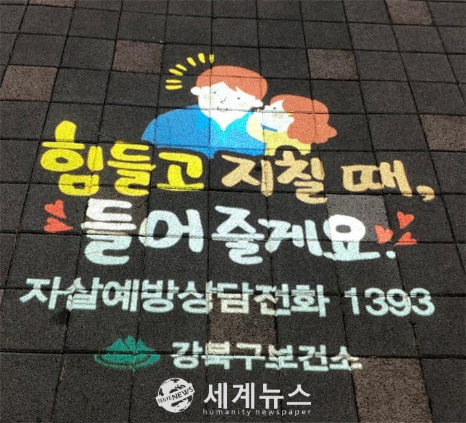 [세계뉴스 윤소라 기자] 강북구(구청장 박겸수)가 자살률 감소 및 생명사랑문화 확산을 위해 지난달 24일 관내 3곳에 생명존중문구가 들어간 로고젝터를 설치했다.