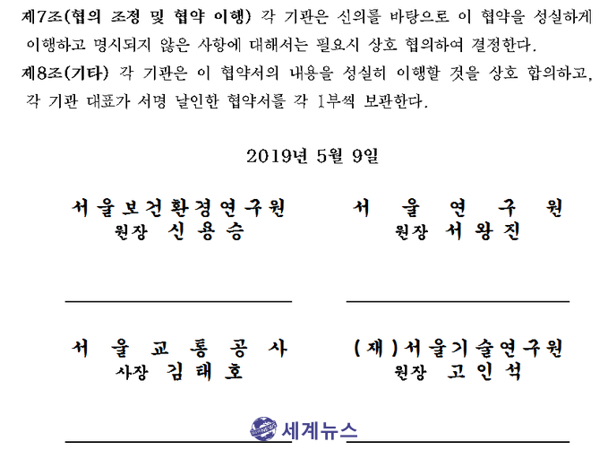 서울기술연구원-서울연구원-서울보건환경연구원-서울교통공사 간 MOU는 9일 오전 11시부터 서울기술연구원 대회의실에서 진행된다.