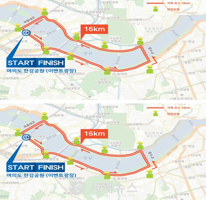 ▲ 가족코스(왕복16㎞)는 여의도 → 반포 잠수교(반환점)→ 마포대교 → 여의도 코스이다. 몽땅코스(왕복51㎞)는 여의도 → 반포(잠수교) → 구리암사대교(반환점) → 잠실 → 여의도 코스이다. |