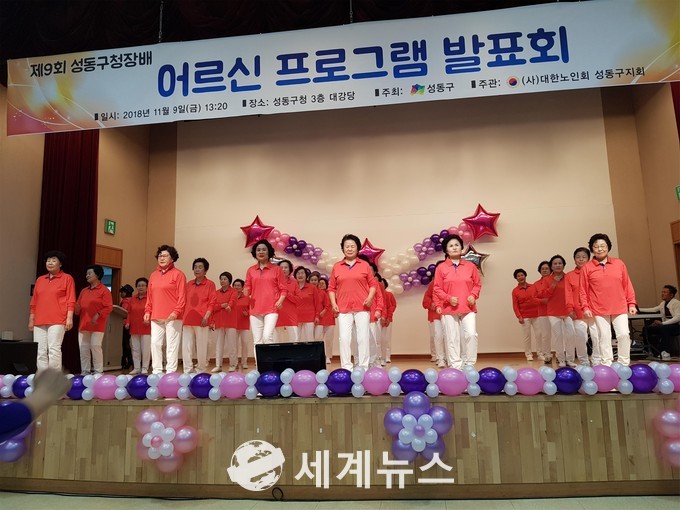 ▲ 지난 9일 열린 '제9회 성동구청장배 어르신 프로그램 발표회'. 이날 총 15개 팀이 참가해 대현경로복지관은 에어로빅, 라인댄스, 밸리댄스 3개 부문 50명의 어르신이 참가하여 그동안 배운 장기를 마음껏 뽐내는 시간을 가졌다. |