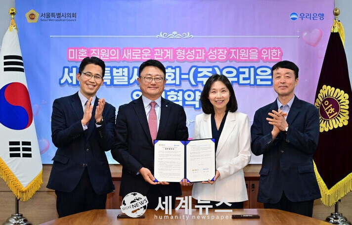[세계뉴스 = 윤소라 기자] 서울시의회와 우리은행이 미혼 직원들의 만남을 위한 특별한 행사를 추진한다. 두 기관은 결혼 친화적 조직문화를 확산하기 위해 지난 9일 업무 협약을 체결했다고 10일 밝혔다.