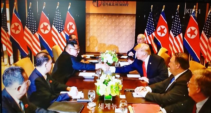 [세계뉴스] 탁병훈 기자 = 트럼프 미국 대통령과 김정은 북한 국무위원장이 12일(현지시간) 중립국인 싱가포르의 휴양지 센토사 섬의 카펠라 호텔에서 단독 정상 회담에 이어 확대 정상 회담을 하고 있다.