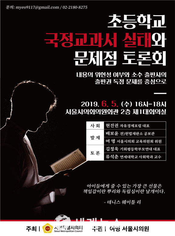 [세계뉴스] 정서영 기자 = 서울시의회 여명 의원(자유한국당·비례)이 오는 5일 오후4시 서울시의회의원회관 제1대회의실에서 ‘초등 국정교과서 출판 실태와 개선 방향’ 토론회를 주관한다.