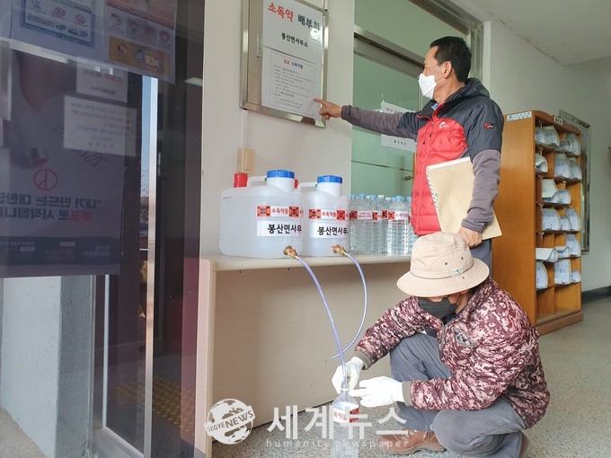 [세계뉴스 한차수 기자] 담양 봉산면(면장 김민지)은 주민들이 자율적으로 소독을 함으로써 코로나19의 실질적인 예방에 참여할 수 있도록 면사무소에서 살균소독제를 무료 공급한다.