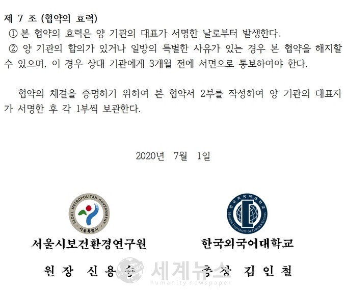 [세계뉴스 윤소라 기자] 서울시보건환경연구원과 한국외국어대가 미세먼지 걱정 없는 서울 만들기를 위해 협력한다. 양 기관은 7월 1일 미세먼지의 과학적 원인 분석과 정책 개발을 위한 연구교류 협약을 서면으로 체결한다.