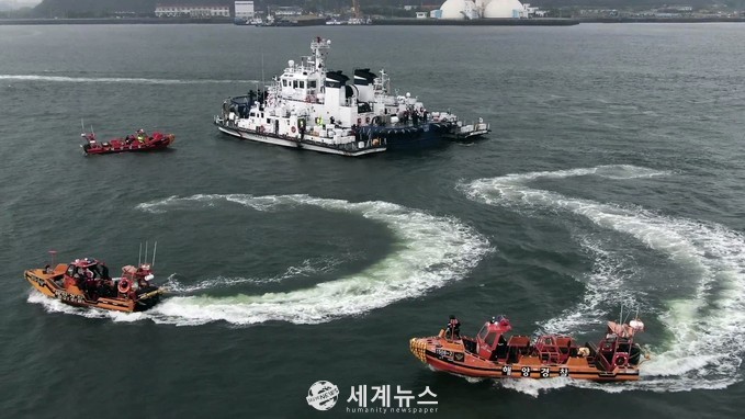 [세계뉴스 한차수 기자] 서해지방해양경찰청(청장 김도준)이 24일 오후 전남 영암군 대불부두 인근 해상에서 민 . 관 . 군이 참여한 가운데 유조선-화물선 충돌 상황을 가정한 대규모‘국민 참여 민.관.군 합동 수난대비기본훈련’을 실시했다.