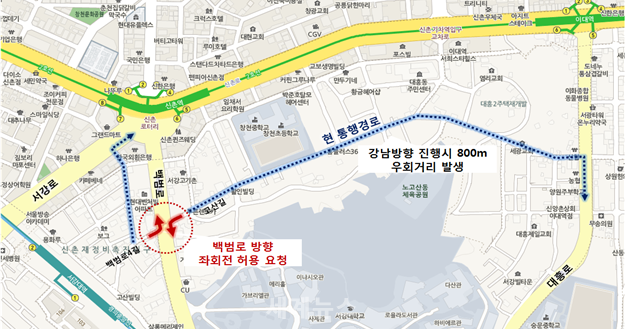 9일 김상훈 서울시의원(더불어민주당, 마포1)은 이면도로(고산길, 백범로4길)에서 백범로 방향 좌회전 불가로 원거리 우회에 따른 주민불편이 많았던 신촌 르메이에르타운 앞 좌회전이 허용된다고 밝혔다.