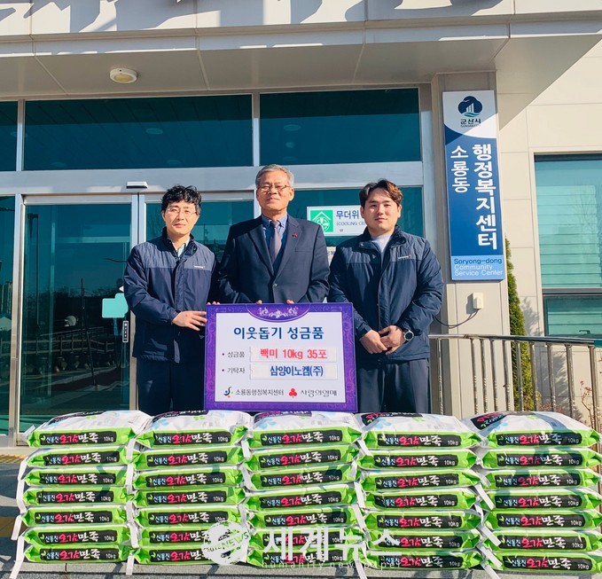 군산시 소룡동은 삼양이노켐(주) 직원들이 지난 20일 연말연시 어려운 이웃들에게 사용해달라며 백미(10kg) 35포(100만원 상당)를 기탁했다고 밝혔다.