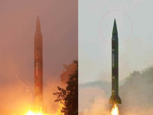 ▲ 北'탄두 개량형' 노동미사일 사진 공개. 왼쪽 사진은 지난 7월 19일 발사 당시 모습. © 세계뉴스 |