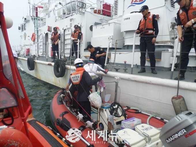 ▲ 군산해경이 엔진이 꺼진 레저보트의 탑승객을 구조하고 있다. |
