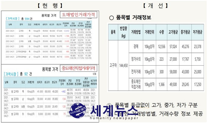 [세계뉴스 김형수 기자] 서울시농수산식품공사(사장 김경호)는 가락시장 개장 이래 36년 동안 제공해왔던 가격정보에 대해 대대적인 개선을 추진할 예정이다.