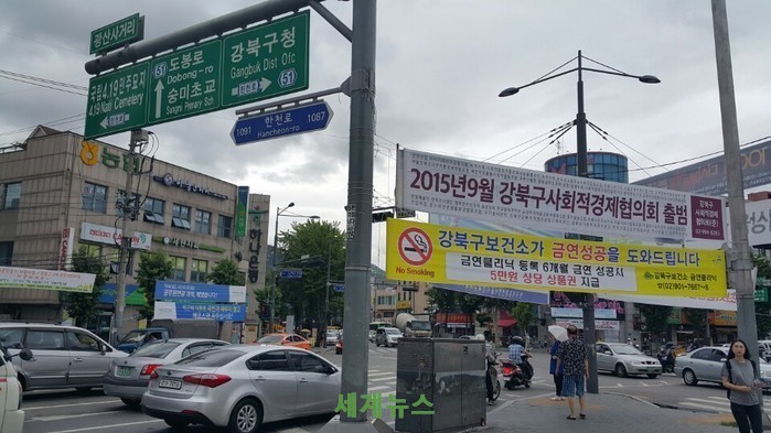 ▲ 강북구 광산사거리 앞 무분별하게 게시되어 있는 불법현수막 © 세계뉴스 |