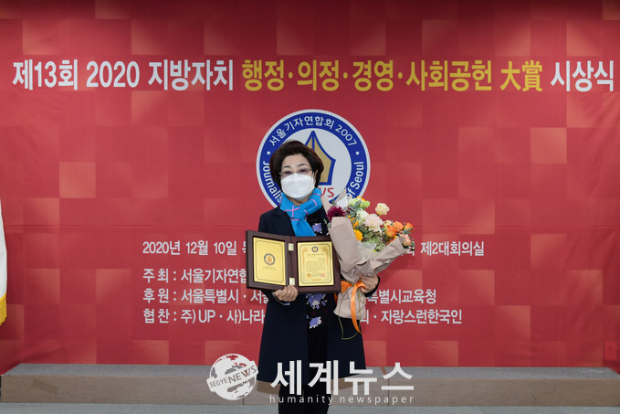 [세계뉴스 정서영 기자] 서울시의회 김춘례 의원(더불어민주당, 성북1)은 10일 오후 3시 서울특별시의회의원회관 제2대회의실에서 열린 서울기자연합회 ‘2020 지방자치 행정·의정·경영대상’에서 지방자치 의정대상을 수상했다.