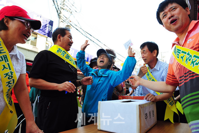 ▲ 추석 이벤트 전통시장 경품추천에서 당첨이 된 여성 참여자가 환호성을 지르며 기뻐하고 있다. 동대문구는 전통시장 살리기에 적극적으로 매진하고 있다. © 세계뉴스 |