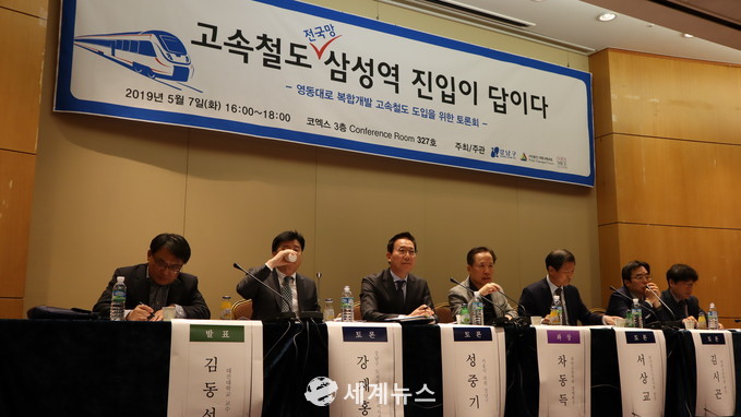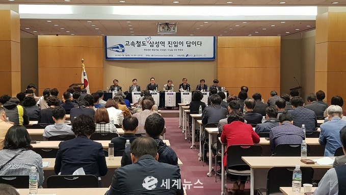 [세계뉴스] 정서영 기자 = 강남구와 대중교통포럼, CMC(Coex Mice Cluster)가 7일 강남구 삼성동 코엑스 3층 컨퍼런스룸에서 공동 주최한 ‘영동대로 복합개발 관련 고속철도 도입을 위한 토론회’는 차동득 대한교통학회 명예회장을 좌장으로 “강남도심 삼성역, 고속열차 서비스 제공되어야 한다”는 김동선 교수의 주제발표가 있었다.