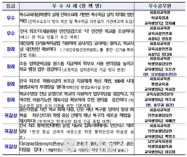우수상에는 '특수교육대상학생의 실제 진학수요에 기반한 특수학급 설치 최적화 방안'이 선정됐다. 이 사례는 진학수요조사 방식을 1개년에서 5개년 계획으로 개선하고, 특수학급 의무설치 사전예고제를 최초 도입하여 높은 평가를 받았다. 또 다른 우수사례로는 '더 세분화된 안전점검으로 더 안전한 학교 조성'이 있다. 이 사례는 건축물 안전등급을 기존 5단계에서 8단계로 세분화하고, 사전 예방시스템을 구축해 안전성을 높였다.