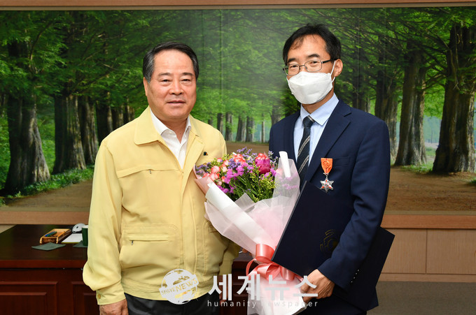 ▲ 최형식 담양군수는 18일 담양군청에서 ‘제6회 대한민국 공무원상’ 수상자에 대한 정부 유공 포상 전수식에서 농업기술센터 이철규 과장에게 시상했다. |