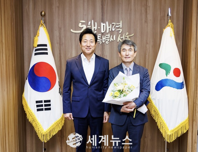 ▲ 오세훈 서울시장으로부터 임명장을 받은 서울교통공사 신임 백호(오른쪽) 사장이 기념촬영을 하고 있다. |
