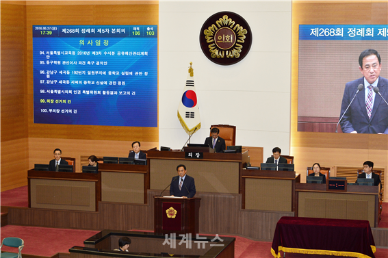 ▲ 양준욱 신임 의장. 서울시의회 제9대 후반기 의장선거에서 양준욱(더민주, 3선) 의원이 당선 인사말을 하고 있다. © 세계뉴스 |
