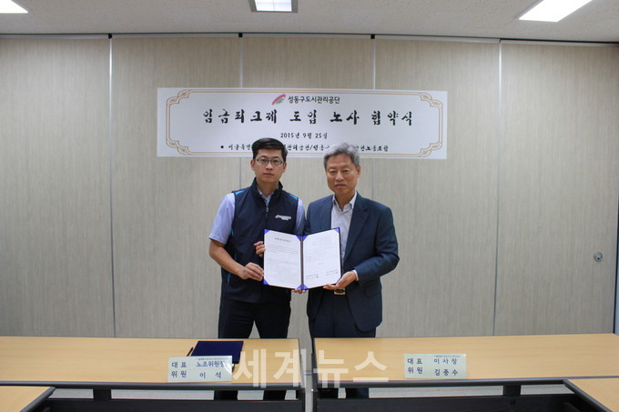 ▲ 성동구도시관리공단 김종수 이사장(오른쪽)과 이석 노조위장(왼쪽)은 25일 임금피크제를 전격 시행하기로 합의했다. 이로써 성동구도시관리공단이 서울시 24개 자치구 공단 중 최초 임금피크제 시행 공단이 됐다. © 세계뉴스 |