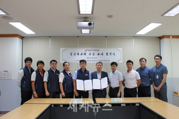 ▲ 임금피크제 도입 노사협약식. 25일 성동구도시관리공단 김종수 이사장(가운데)과 이석 노조위장은 임금피크제 도입을 전격 시행하기로 합의했다. 이로써 서울시 24개 자치구 공단 중 성동구도시관리공단이 최초 임금피크제 시행 공단이 됐다. © 세계뉴스 |