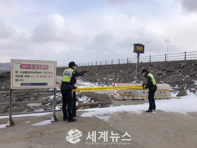 ▲ 군산해경 비응파출소 순찰구조 팀원들이 연안 안전사고를 예방하기 위해 인근 순찰과 위험구역 출입통제를 하고 있다. |