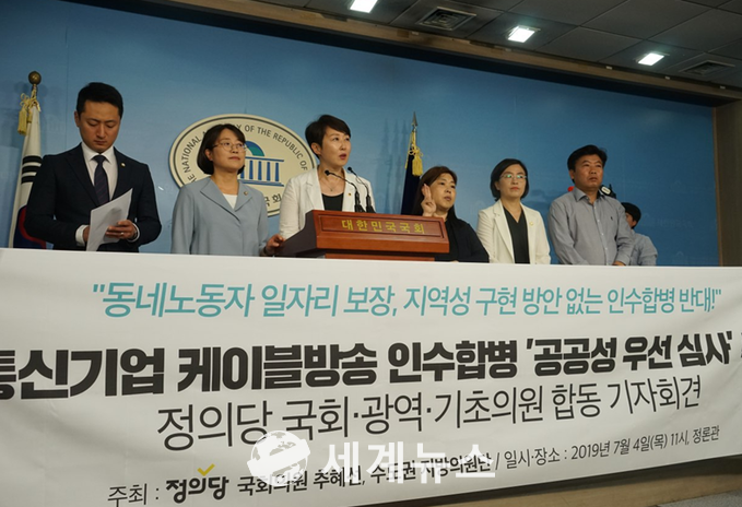 권수정 서울시의원(정의당, 비례대표)은 지난 4일 오전 11시 국회 정론관에서 추혜선 국회의원(정의당, 비례대표)를 비롯한 지방의원 13명과 통신기업 케이블방송 인수합병 ‘공공성 우선 심사’ 촉구 기자회견을 가졌다.