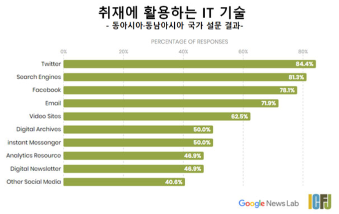 한국을 포함한 동아시아와 동남아시아 국가에서 검색엔진에 의존도도 높다는 점을 알 수 있다. 반면, 전 세계 기자가 취재에 많이 사용하는 기술은 페이스북, 트위터, 이메일, 검색엔진 순이었다.