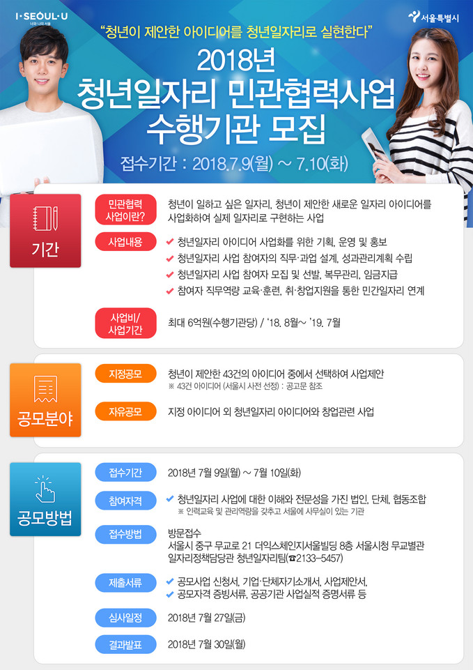 서울시는 청년일자리사업을 추진할 수 있는 역량 있고 전문성을 갖춘 민간기관을 오는 6월 11일부터 7월10일까지 모집한다.