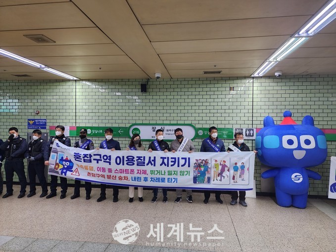 [세계뉴스 차성민 기자] 서울교통공사(이하 공사)와 지하철경찰대(이하 경찰대)가 지하철 내 범죄예방과 혼잡 시 안전한 이용수칙을 알리는 합동 캠페인을 8일 오후 3시 2호선 잠실역에서 진행했다.