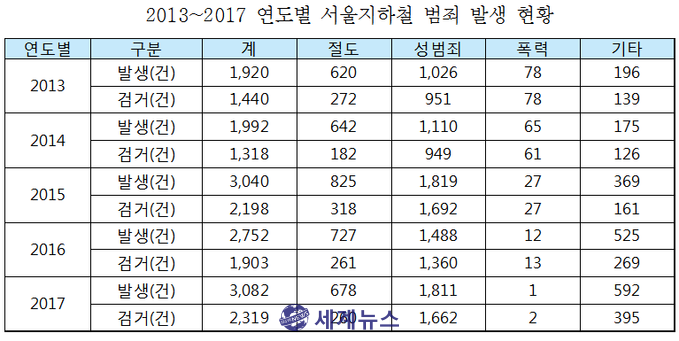 2017년 발생한 서울지하철 전체 범죄는 3,082건이고, 검거건수는 2,319건이다. 이는 전년 대비 각각 330건, 416건 증가한 수치다. 주목할 점은 2017년 서울지하철의 성범죄 발생건수가 1,811건으로 2016년 1,488건에서 323건 증가하는 양상을 보여 서울지하철에서 증가한 대부분의 범죄가 성범죄에서 이루어졌다는 사실이다.