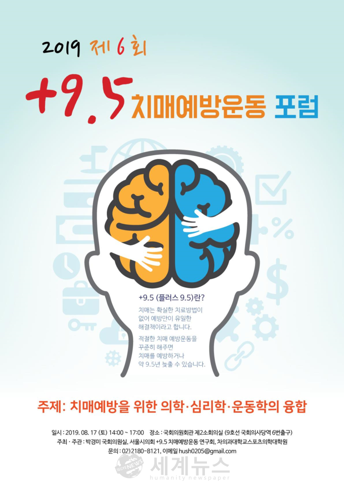 [세계뉴스] 정서영 기자 = 서울시의회 문병훈 의원(더불어민주당, 서초3)이 대표를 맡고 있는 서울시의회 ‘+9.5 치매예방운동연구회’는 오는 17일 오후2시 국회의원회관 제2소회의실에서 ‘2019 제6회 +9.5 치매예방운동포럼’ 을 개최한다.