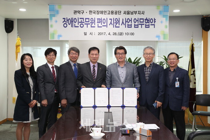 [세계뉴스] 전승원 기자 = 관악구(구청장 유종필)가 장애인공무원 편의 지원 사업의 효율적인 추진을 위해 지난달 28일 한국장애인고용공단 서울남부지사(지사장 김태양)와 업무협약을 체결했다.