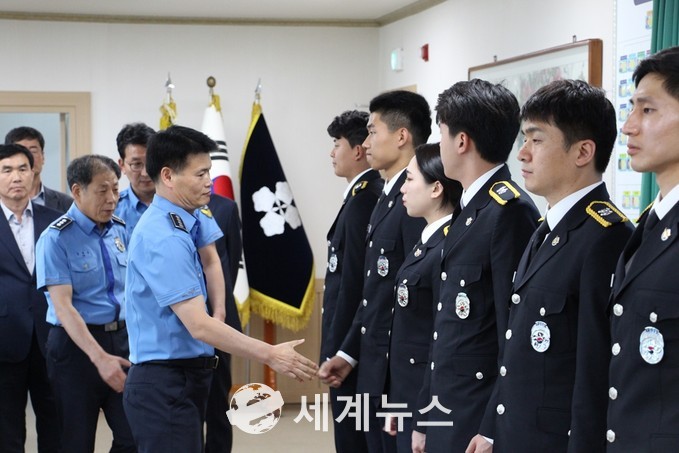 ▲ 4일 군산해양경찰서 서정원 서장이 해양경찰교육원 신임경찰 과정을 이수한 한상원(25) 순경 등 9명과 일일이 악수를 하며 자긍심을 심어주고 있다. 이들은 오는 8월 23일까지 12주 동안 현장 관서실습에 들어간다. |