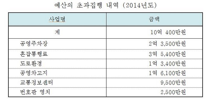 시설관리공단은 편성된 예산보다 초과해서 집행한 금액만도 10억원에 달해 시의회의 예산 심의·의결권을 훼손한 것으로 드러났다.