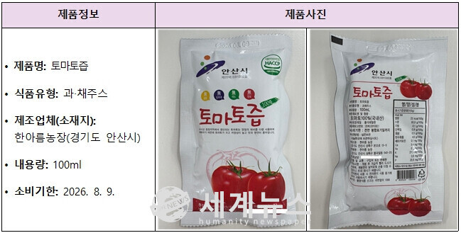 [세계뉴스 = 차성민 기자] 식품의약품안전처는 경기도 안산시에 위치한 식품제조·가공업체 '한아름농장'이 제조한 '토마토즙'에서 납이 기준치를 초과해 검출됨에 따라 해당 제품의 판매를 중단하고 회수 조치에 들어갔다고 발표했다.